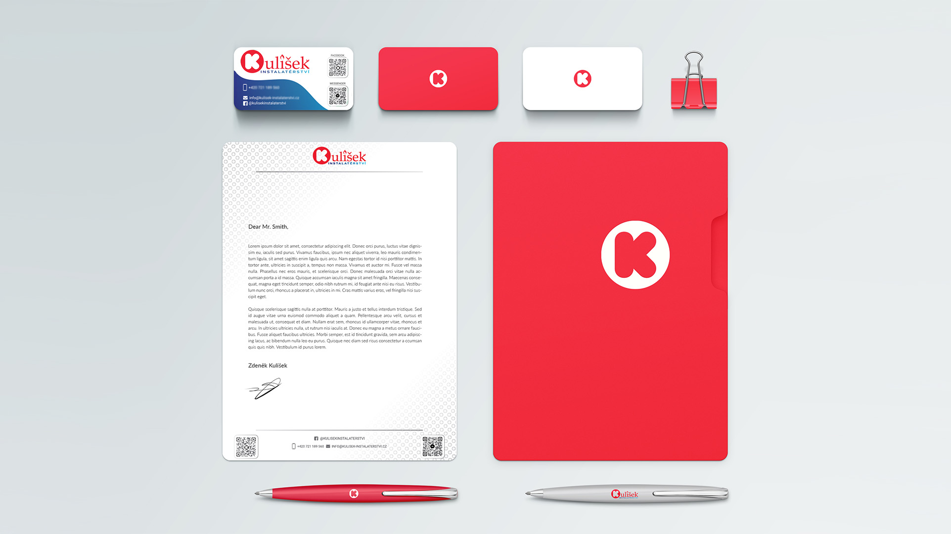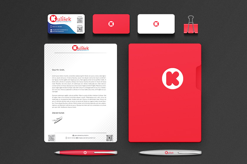 • Hlavičkové papíry si přál klient vytvořit v několika barevných provedeních s brandingovým paternem v pozadí a QR kódy v patičce
